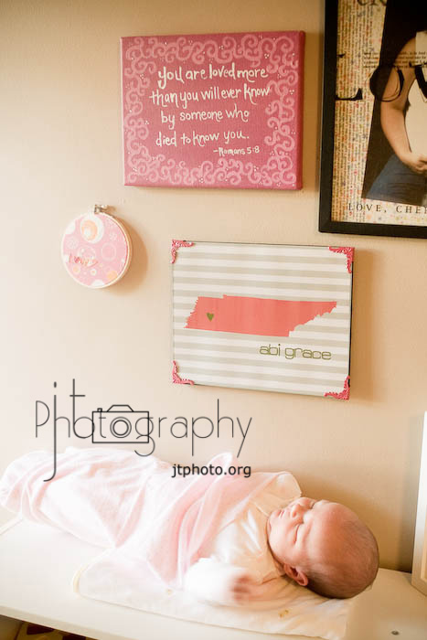 For some reason I've always wanted to take a picture of my kids on a bookshelf. Greg and I have always loved books...collecting them, reading them, storing them, moving them ;). But really I just love those "baby on a bookshelf" photos...so I thought I'd give it a try. While I got everything ready Abi was totally asleep (in the other room) but by the time I finished "setting the stage" she had started to wake up. So I was only able to get one photo of her with her eyes closed and sleeping, because then she started crying. So I really only got one "sleeping baby on the bookshelf" photo, but it turned out pretty good so I'm okay with that. I put her in her crib (which she'll sleep in in a few months) and she immediately calmed down, so I took advantage and got a few shots of her lying in her crib (I love those shots as well). I just wish I would have had her embroidery hoop name done (it'll hang above the 'dream' bunting) but once I get it done I'll try these photos again.
